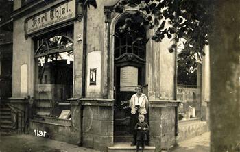data dodania fotografii 2013-05-03 Sklep Karla Thiela znajdujący się w kamienicy przy dawnej ul. Południowej 68. Na zdjęciu widoczna rodzina Thiel, zdjęcie z ok. 1920 r. (WFG, Thiel) |