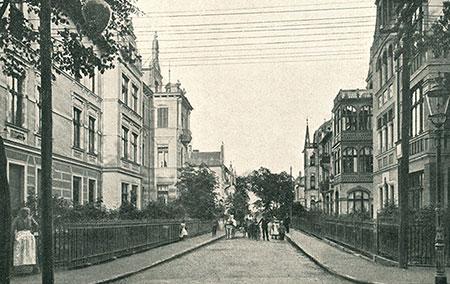 data dodania fotografii 2007-08-15 Widok na dawną ul. Północną, wejście do Parku Północnego. Po lewej stronie między zabudowaniami widoczna Kaplica Polska oraz Hotel Północny, zdjęcie z ok. 1907 r. (KC, Clara Bernthal, foto. John Faltin) | Kaplica Polska