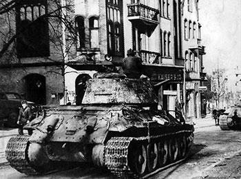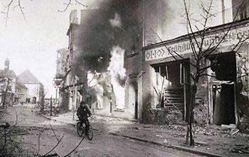 data dodania fotografii 2016-09-13 Ul. Bohaterów Monte Cassino , zniszczony budynek hotelu Cafe Haueisen, oraz paląca się kamienica pod numerem 62, zdjęcie z marca 1945 r. (GK) |