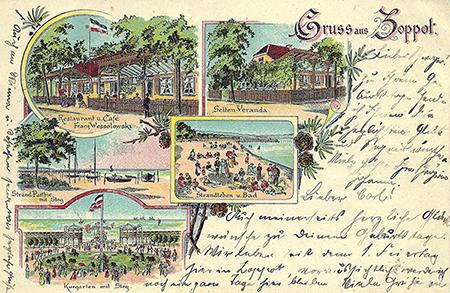 data dodania fotografii 2016-01-01 Dawna ul. Morska i żurnaleria - omnibus konny, na pocztówce przedstawiającej Sopot w 1860 r. (KC) | Cukiernia Greya